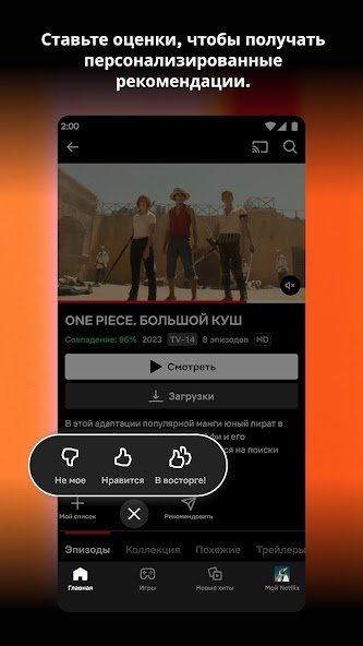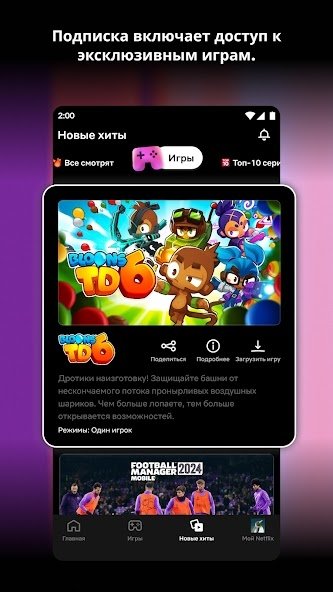Netflix — это ведущий стриминговый сервис, предоставляющий доступ к обширной библиотеке фильмов, сериалов, документалок и оригинального контента от Netflix Studios. Приложение позволяет смотреть всё — от «Карточного домика» до «Страны чудес» — в высоком качестве, с поддержкой HDR и Dolby Atmos на совместимых устройствах.