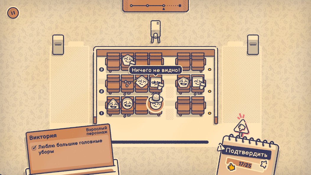 В игре Is This Seat Taken? вам предстоит организовывать группы людей по их капризам и особенностям. Одним важно сидеть у окна, другим — подальше от шумных соседей, а кто-то и вовсе не переносит запах духов. Каждая новая локация — будь то автобус, кинотеатр, свадьба или бар — подкидывает свежие задачи и неожиданные сочетания характеров. Атмосфера расслабленная: здесь нет ни таймера, ни гонки за очками, только процесс и удовольствие от правильных решений.