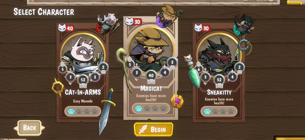 Фишки радуют разнообразием: три героя на выбор — от воина Cat-at-arms до хитрюги Sneakitty и мага Magicat, плюс 169 карт с котами, ведьмами-кошками, катаротами. Уникальность в усилителях вроде меховых карт, золотых и печатей, которые превращают обычную колоду в машину для сумасшедшего дамага, а достижения в стиле "cat-as-trophy" мотивируют копать глубже.