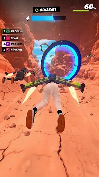 Основная особенность игры заключается в уникальном сочетании гонок и элементов платформера, где каждый заезд превращается в испытание ловкости и реакции. Игроки мчатся по парящим в воздухе трассам, собирают усилители и совершают головокружительные трюки, чтобы поддерживать максимально возможную скорость.