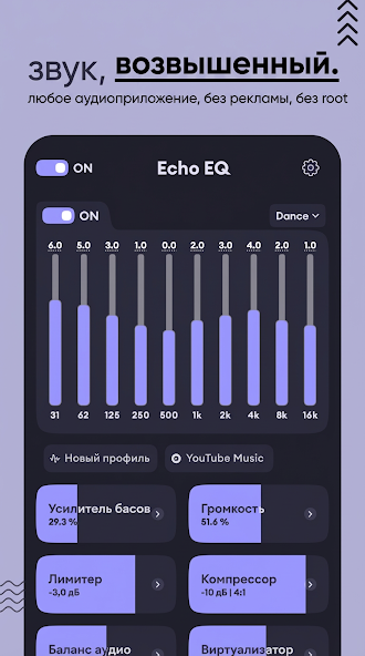 Echo Equalizer: Bass Booster на Android предлагает профессиональный подход к обработке аудио для меломанов и ценителей качественного, насыщенного звука.