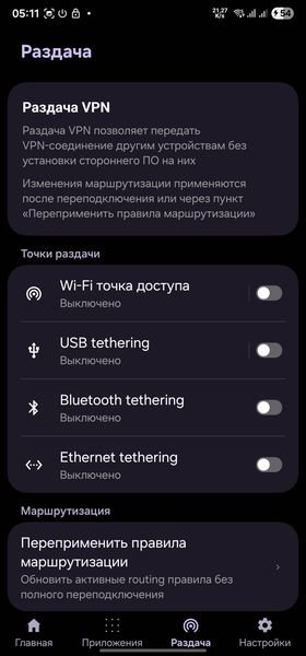 - Раздача сети: Возможность делиться VPN через Wi-Fi, USB и Bluetooth.