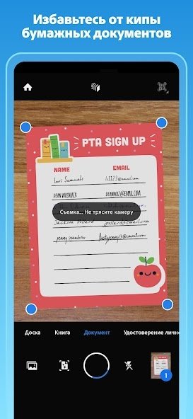 Основная особенность Adobe Scan — автоматическая и точная обработка документов. Приложение распознаёт границы листа даже под углом, корректирует перспективу, убирает тени и повышает контраст, создавая чёткие сканы, сравнимые с работой офисного сканера. Благодаря технологиям Adobe Sensei (искусственный интеллект), оно автоматически определяет тип документа — счёт, визитка, заметка — и оптимизирует обработку под него.